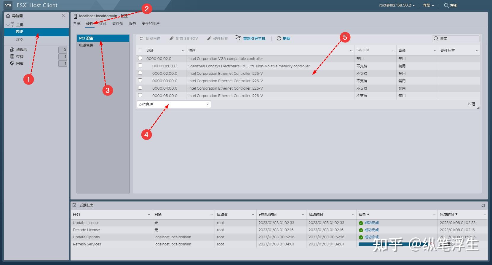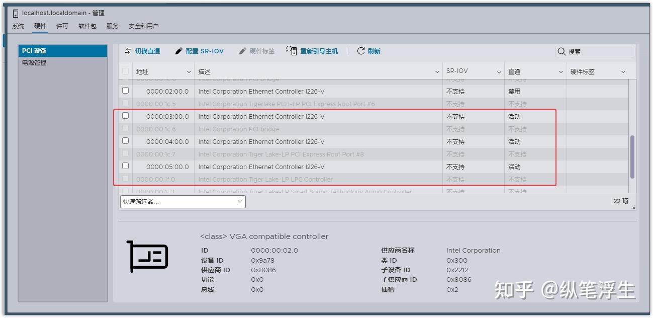 选择【管理】-【硬件】-【PCI设备】,查看可以直通的网卡,这里网卡的顺序就是按照我们物理接口的etho、eth1、eth2、eth3顺序来的,第一个网卡千万不要直通, 也就是我们前面设置的ESXi管理口,不要设置直通。如果把管理口也做了直通,ESXI 重启后 WEB 管理界面就进入不去了。