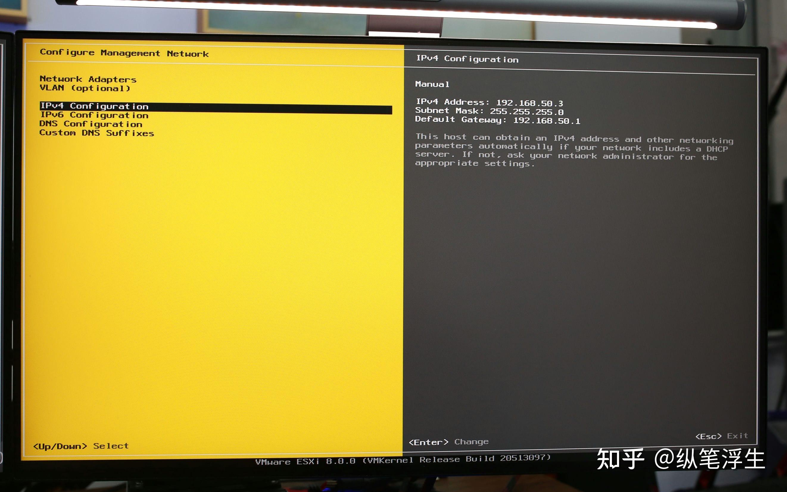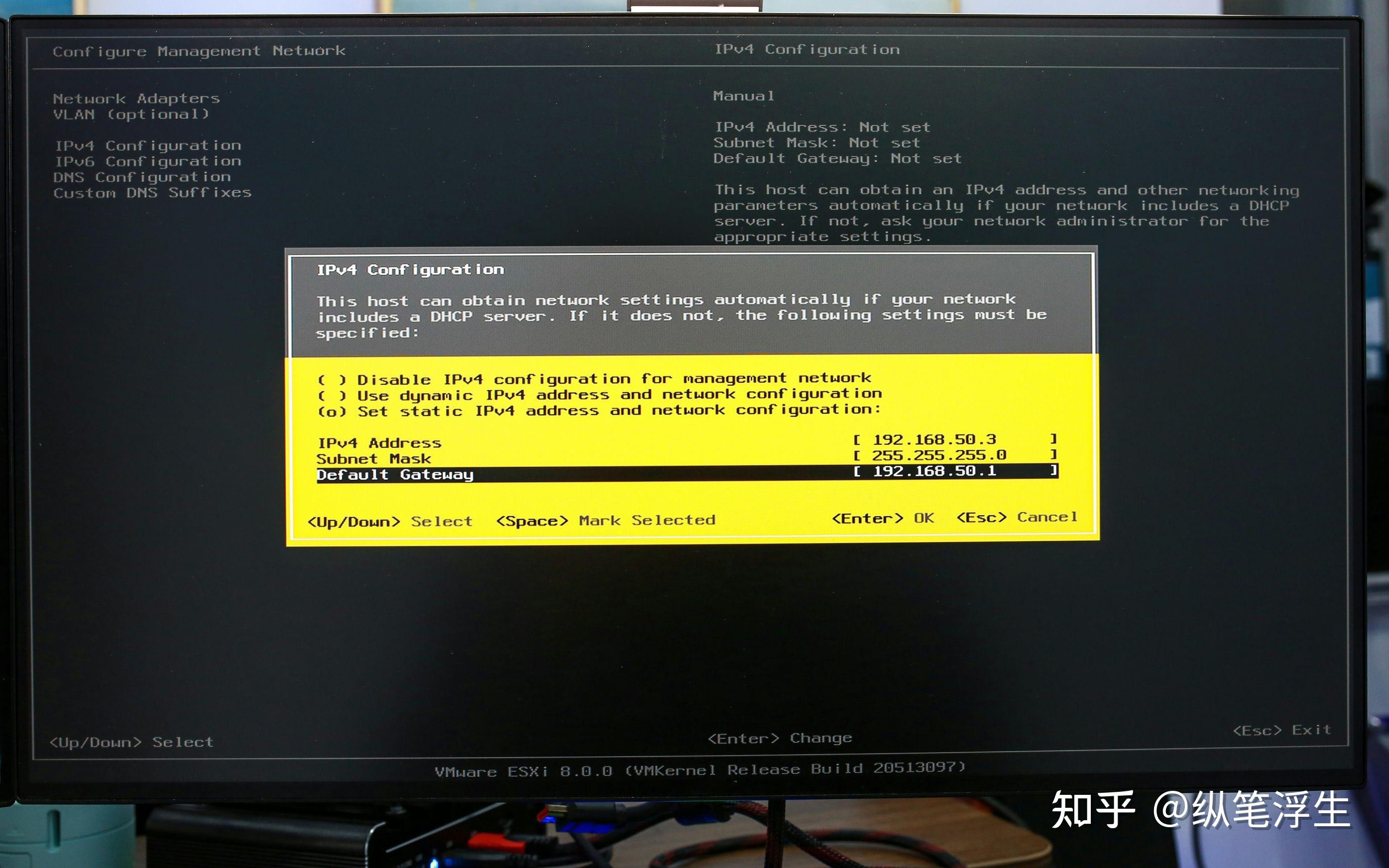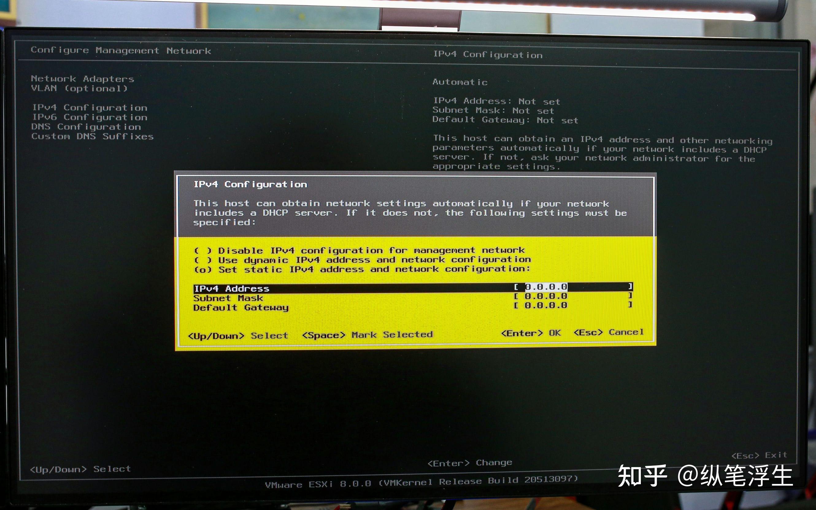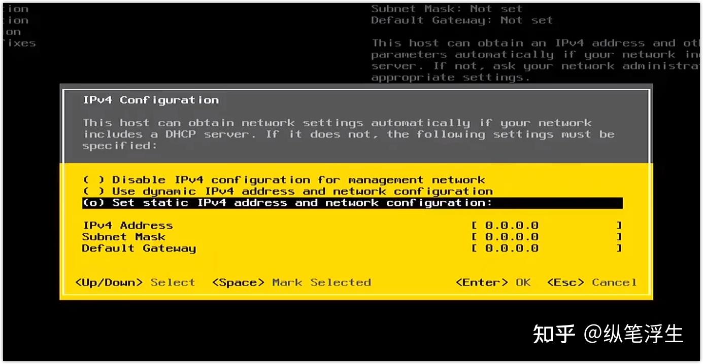 设置下面三个选项【IPV4 Address(ESXI管理地址)】、【Subnet Mask(子网掩码)】、【Default Gateway(默认网关)】: