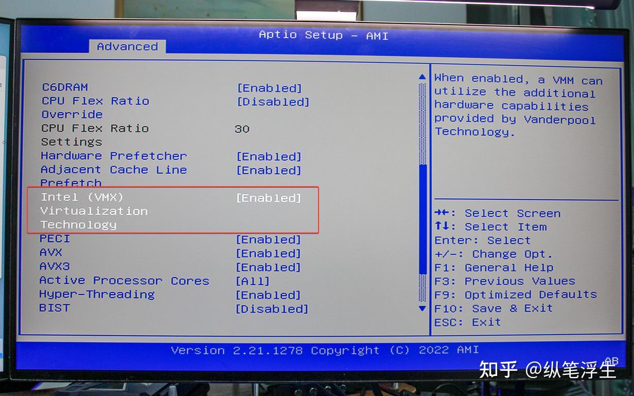 开机按 del/esc 进入BIOS设置,进入 BIOS 后,首先打开处理器的虚拟化(即 VT-x)。