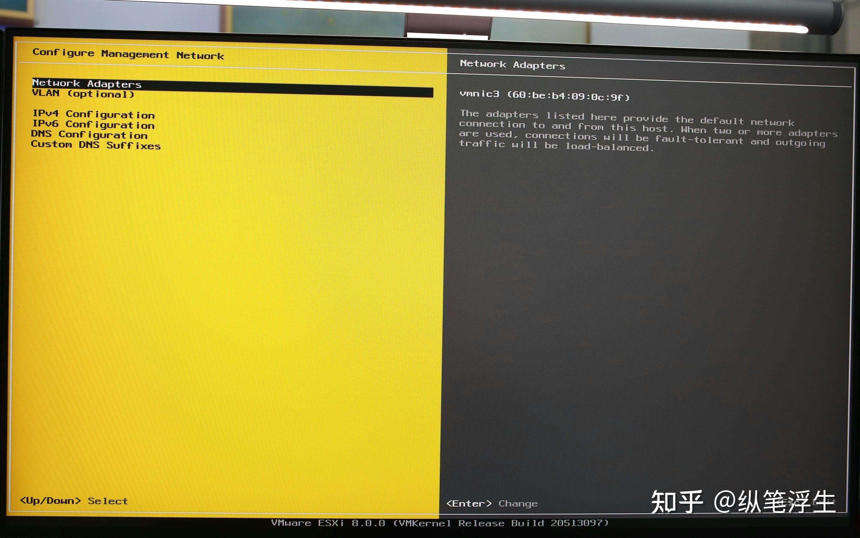 上下键选择你要用来管理ESXI的网口,这里有些工程机的网口是错乱的,可以通过插拔网线来确定是不是正确。如果不正确的话,需要通过后面在web端设置进行接口对应。