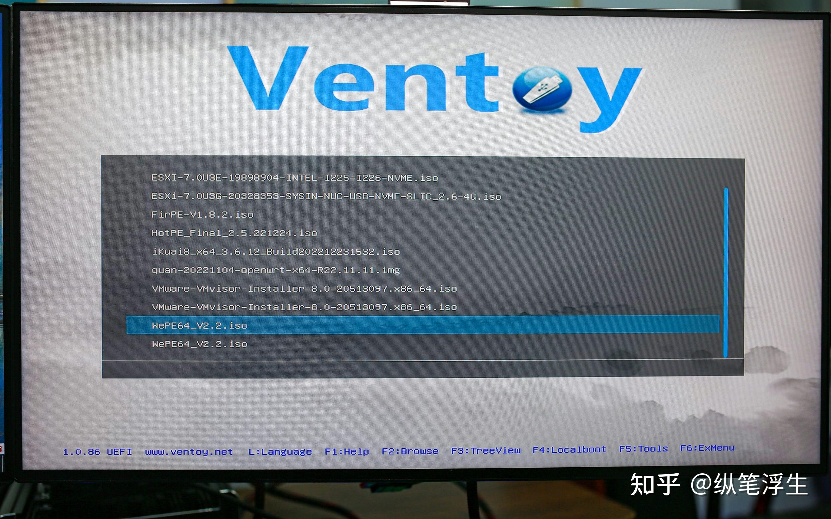 重启开机后,即可进入 Ventoy 界面,U 盘内保存的系统镜像都在列表中,选择要安装的镜像文件即可,选择启动WinPE64,按Enter键进入PE。