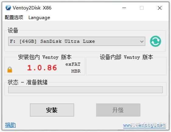 在PC上安装,并运行Ventoy 软件,程序会自动检测当前 USB 设备。如果插入了多个U盘注意识别,别搞错了,造成数据丢失。点击安装开始制作: