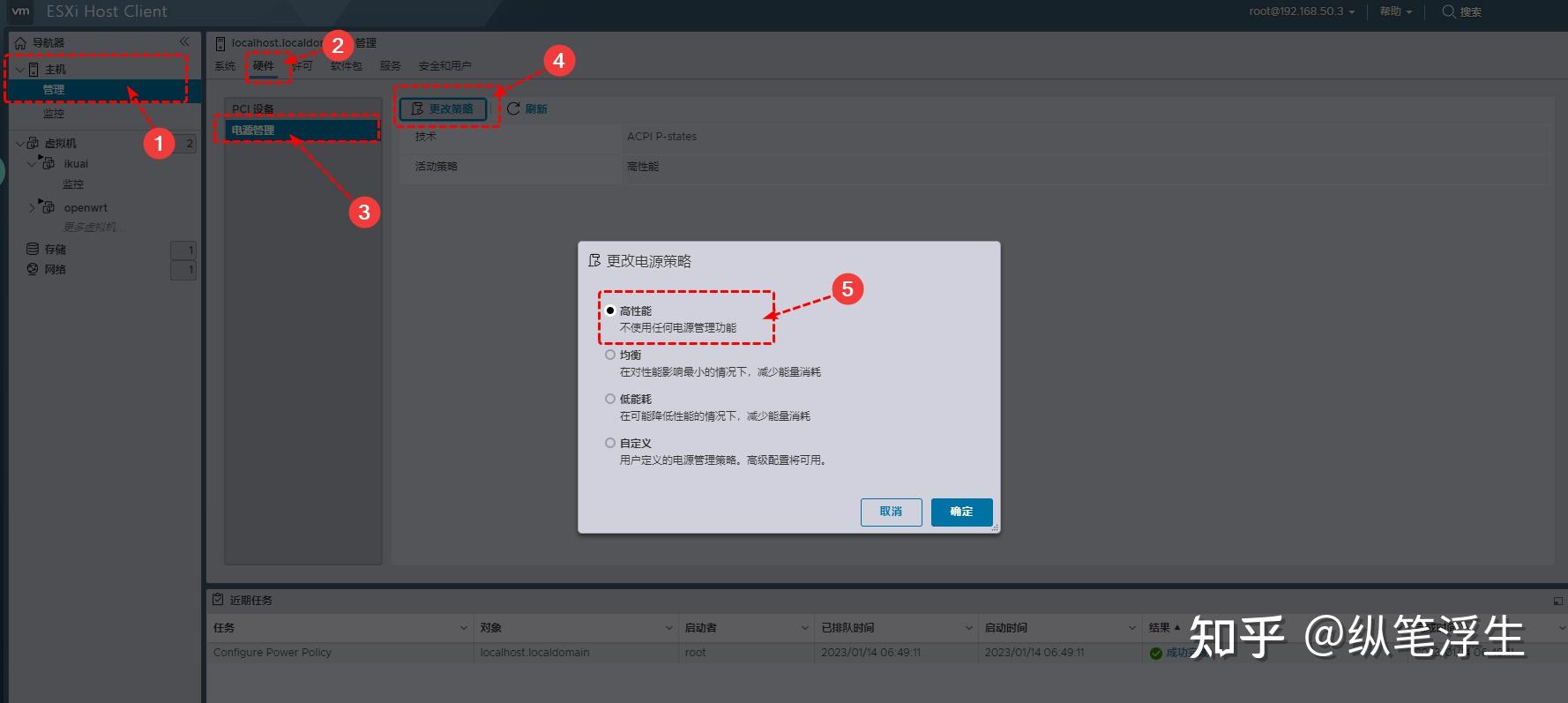 选择【管理】-【硬件】-【电源管理】-【更改策略】-高性能: