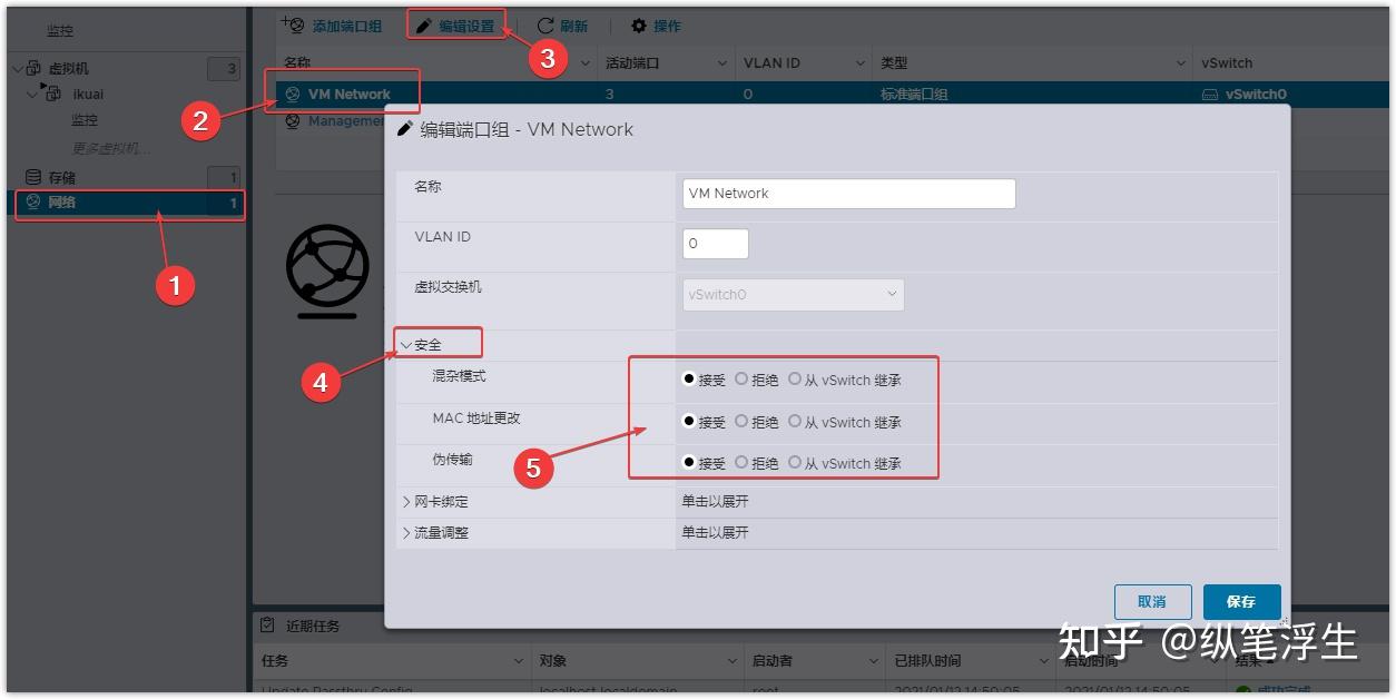 在网络内对虚拟机 VM Network 进行设置,选择【编辑设置】——安全内的混杂模式、mac地址改变、伪传输都改为接受:
