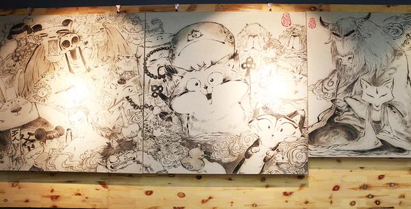进门有一副很大的全家福,据说是王溥为芝麻狐的第一次线下展位手绘的。