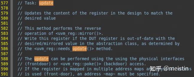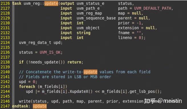 update()这个函数定义在了uvm_reg中,后面我们将uvm_reg中的方法的时候会具体介绍,简而言之就是说当m_mirrored与m_desired不相等时就讲m_mirrored值更新为m_desired值,并执行总线write行为将DUT上对应的寄存器也更新为m_desired值。