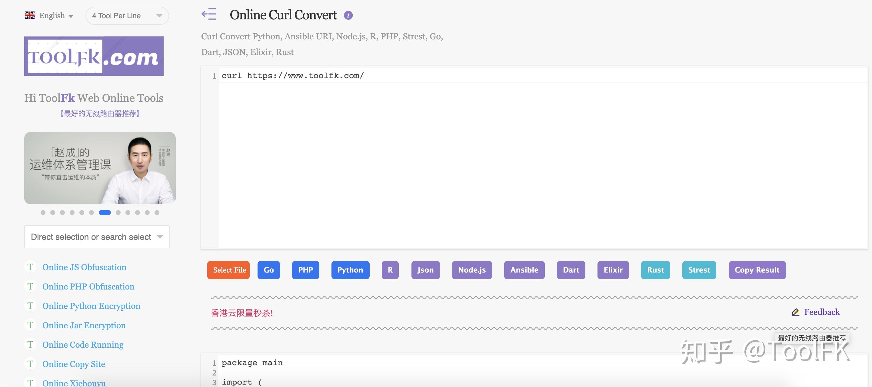 本文要推荐的[TOOLFK]在线CURL转代码工具,支持将curl命令转Python, Ansible URI, Node.js, R, PHP, Strest, Go, Dart, JSON, Elixir, Rust目标代码