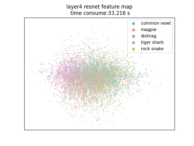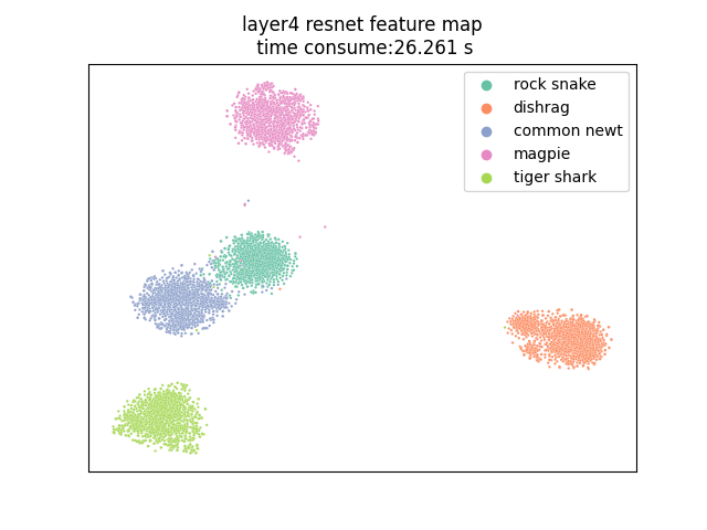 除了对数据集进行降维以外,t-sne还被经常用来对特征图进行降维。以resnet为例layer4是骨干网络的最后一层,每个样本对应特征图的输出尺寸为(512,7,7),也就是说特征图的维度是512x7x7=25088。我用resnet34的预训练权重加载模型,以Imagenet中的5个子类作为测试数据,对layer4输出的特征图进行降维后的可视化结果如图3。可以看到模型已经可以很好的从图片中提取到区分不同类样本的特征了。