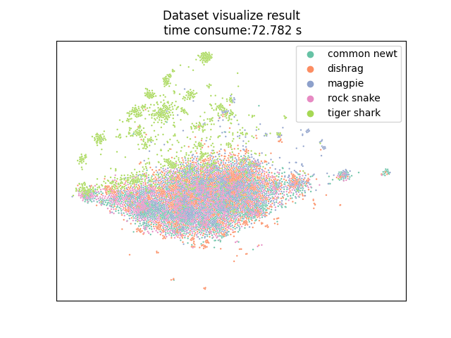 我在Imagenet数据集中选择了其中5个类的数据进行测试,图2为对这5个类的图片降维可视化的结果。