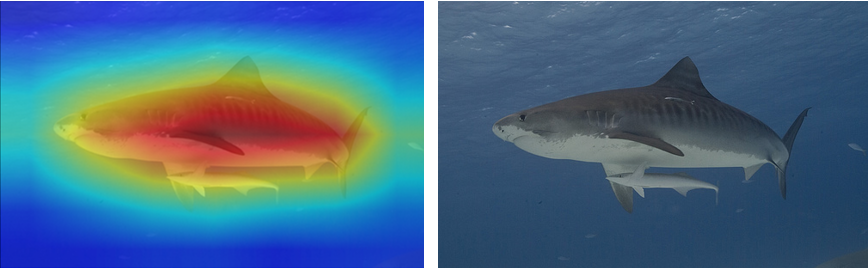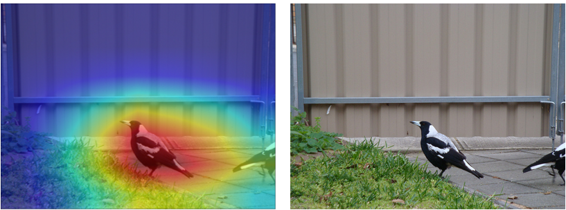Grad-CAM(Gradient-weighted Class Activation Mapping)可以对输入网络的每张图片生成一个热力图,假设网络输出这张图片的类别为'A',那么这个热力图就会呈现图片中每一个位置与'A'这个类别的相似程度,有助于了解原始图像的哪一个局部位置让网络做出了最终的分类决策。还是以预训练的resnet34模型为例,效果如图5和图6所示。图片中的区域越红,代表该区域对模型决策分类的重要程度越高。