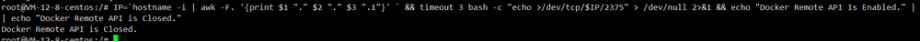 IP=`hostname -i | awk -F. '{print $1 "." $2 "." $3 ".1"}' ` && timeout 3 bash -c "echo >/dev/tcp/$IP/2375" > /dev/null 2>&1 && echo "Docker Remote API Is Enabled." || echo "Docker Remote API is Closed."