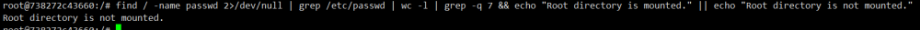 find / -name passwd 2>/dev/null | grep /etc/passwd | wc -l | grep -q 7 && echo "Root directory is mounted." || echo "Root directory is not mounted."