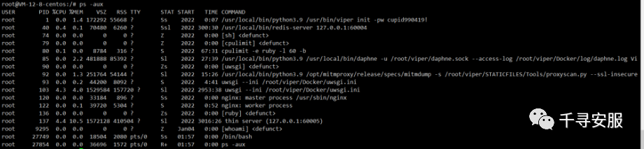 ps -aux 如果使用ps -aux一页就看完了那多半是docker了,因为docker本身是一个删减版的服务器,很多进程不需要启动的他就没有,因而ps -aux看着就很少