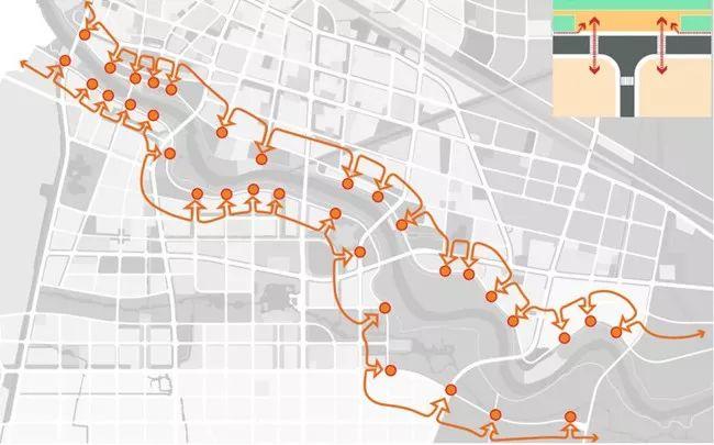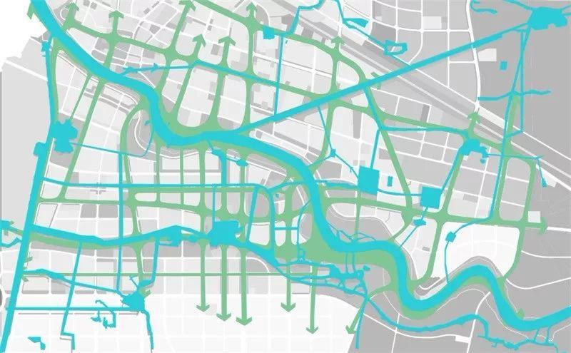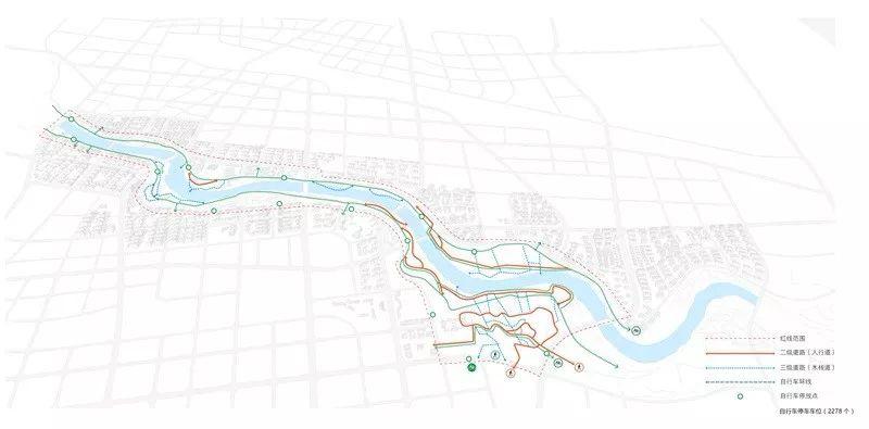 路网系统与城市规划接轨。在堤顶或堤斜面区域构建有别于城市道路的慢行系统,让河堤成为市民可参与、可活动的城市公共空间。