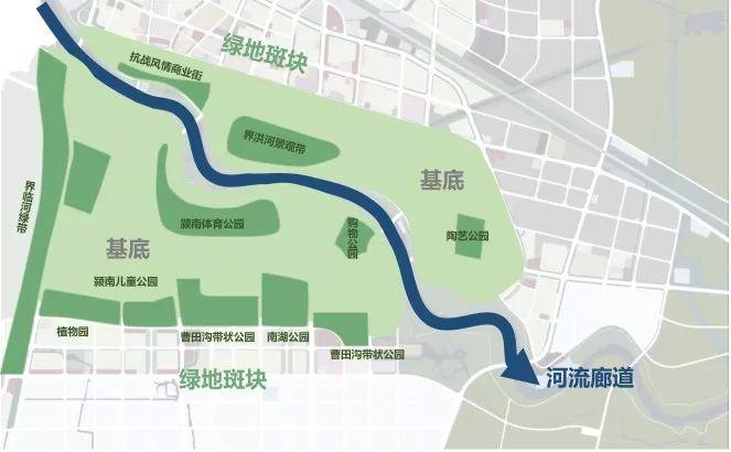 “基底-斑块-廊道”生态模型设计:选取“基底-斑块-廊道”的生态空间模型作为界首市生态网络的依托。沙颍河河流廊道成为了城市生态廊道中的重要组成部分,直接或间接的链接各个城市绿地斑块,形成稳定可持续的生态网络。