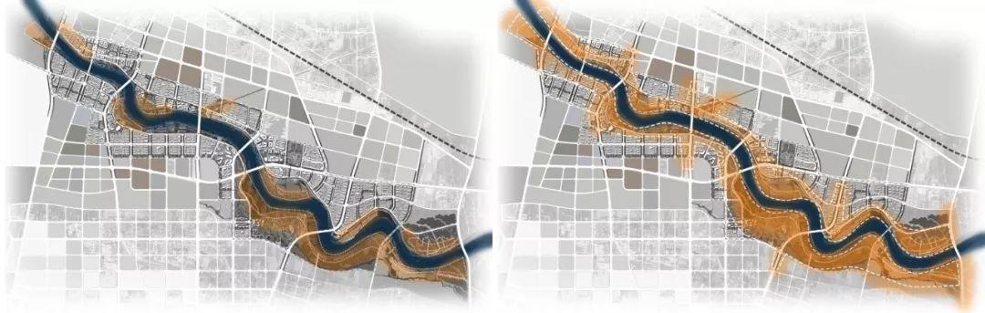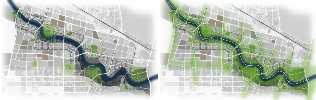在原有规划基础上适当增加水系两侧的城市公共服务用地数量,保证被水域分割的各区域配套服务均衡,同时体现景观、水系对城市用地价值的提升作用。