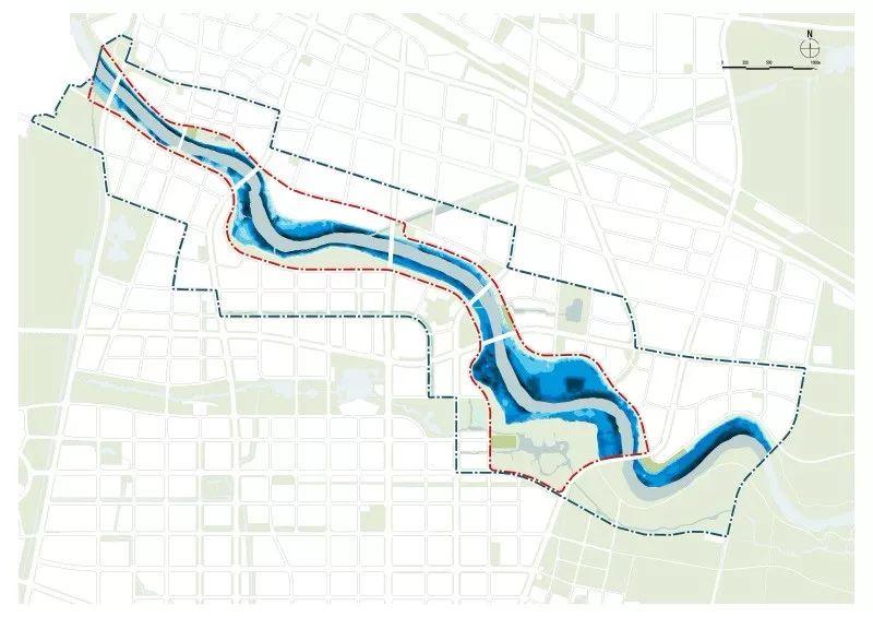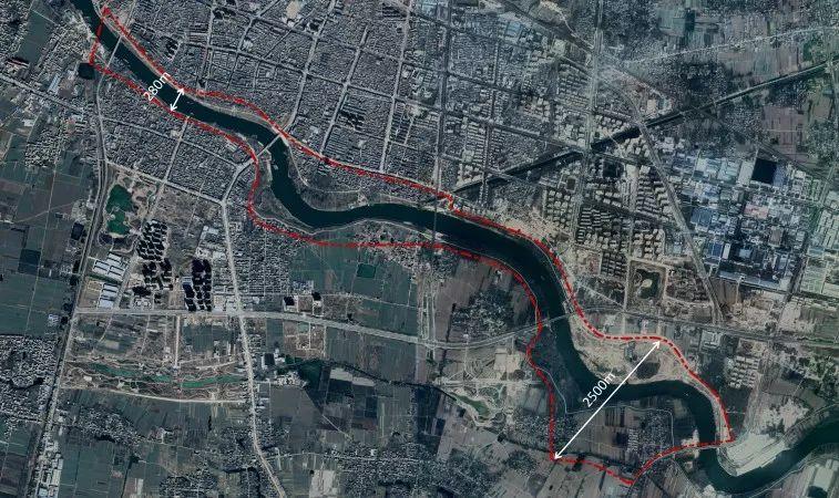本次规划范围——西至省界,东至中心沟,长约9公里,河床宽170-200米,河道水域面积100公顷,景观设计总面积约300公顷。
