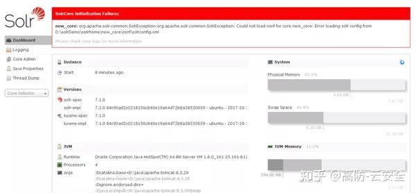 Solr是一个高性能,采用Java开发,基于Lucene的全文搜索服务器。solr的管理界面通常包含如下信息:solr的配置信息(包括路径,用户名,系统版本信息),数据库的配置信息(地址,用户名,密码),数据库搜索数据等。solr未授权访问的危害很大,轻则可查询所有数据库信息,重则可读取系统任意文件,甚至getshell。