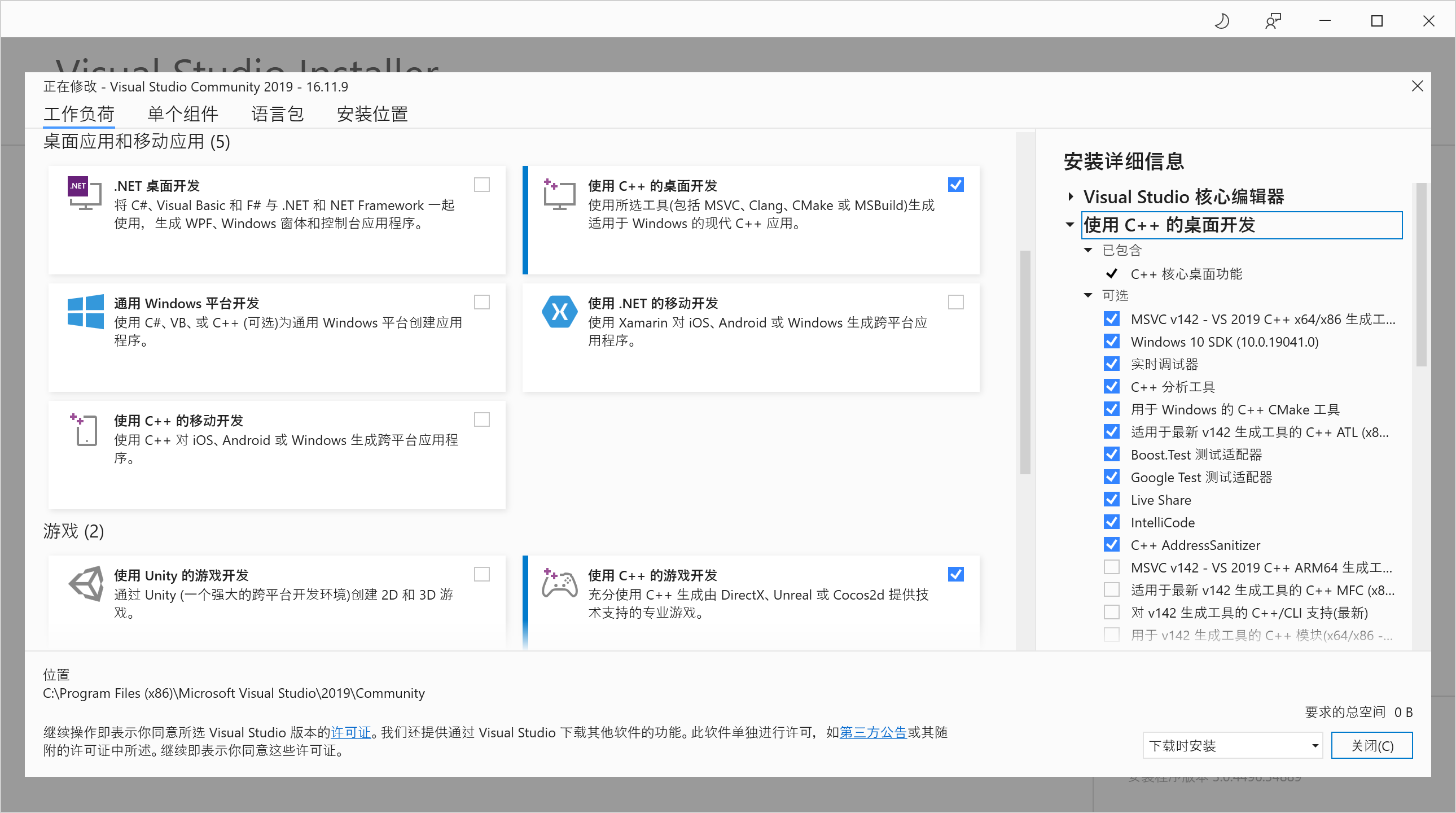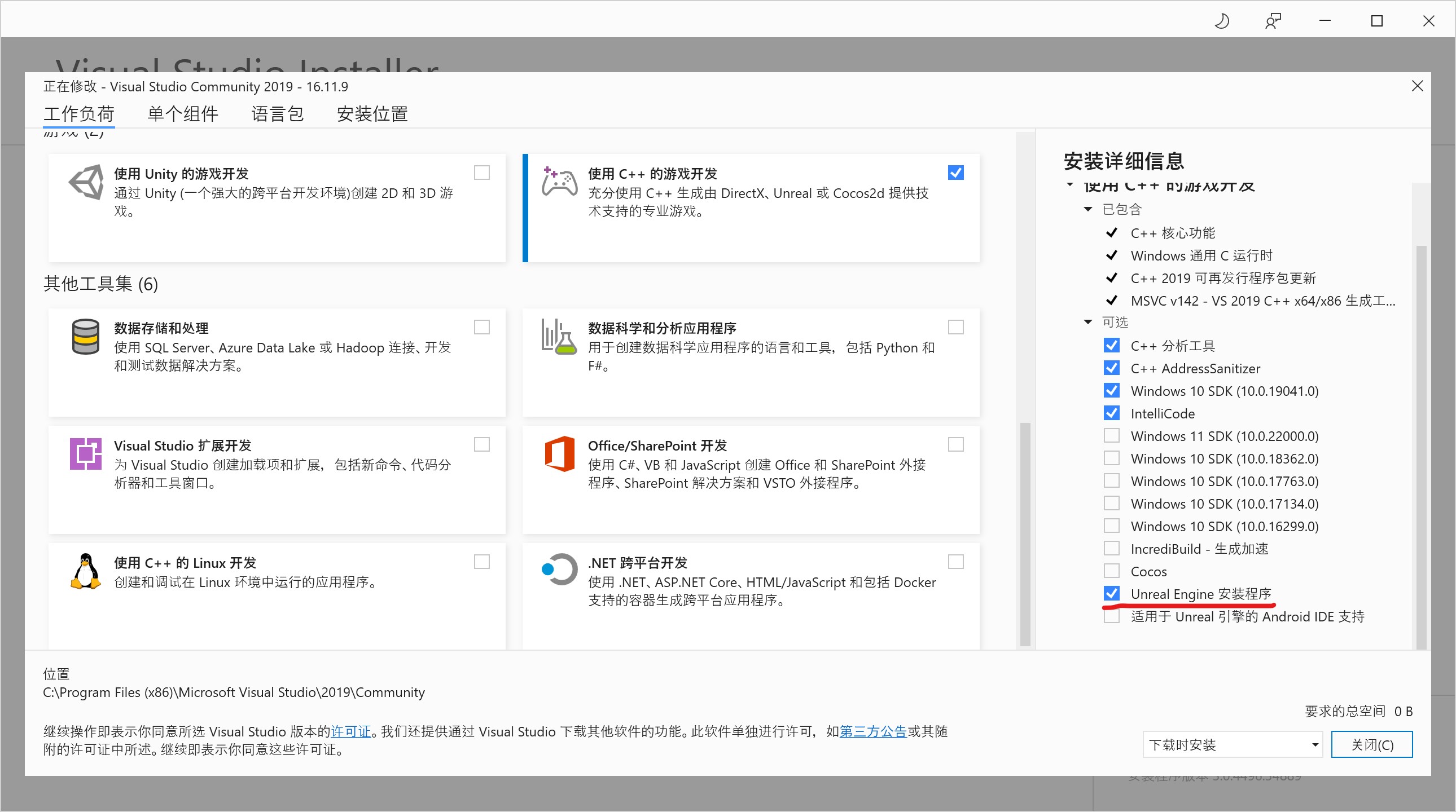 安装器下好了打开,勾选“使用C++的桌面开发”和“使用C++的游戏开发”,并在右侧“安装详细信息”栏里“使用C++的游戏开发”下勾选“Unreal Engine开发程序”。大致如下二图。