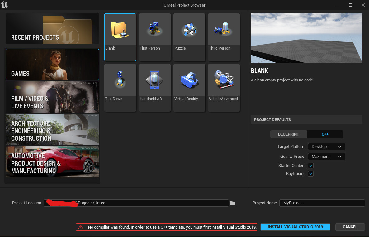 如下图,在下方显示“No compiler was found. In order to use a C++ template, you must first install Visual Studio 2019”