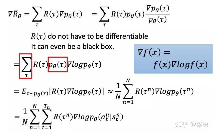 上面的过程中,我们首先利用log函数求导的特点进行转化,随后用N次采样的平均值来近似期望,最后,我们将pθ展开,将与θ无关的项去掉,即得到了最终的结果。