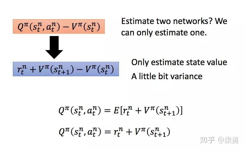 我们常常给Q值增加一个基线,使得反馈有正有负,这里的基线通常用状态的价值函数来表示,因此梯度就变为了: