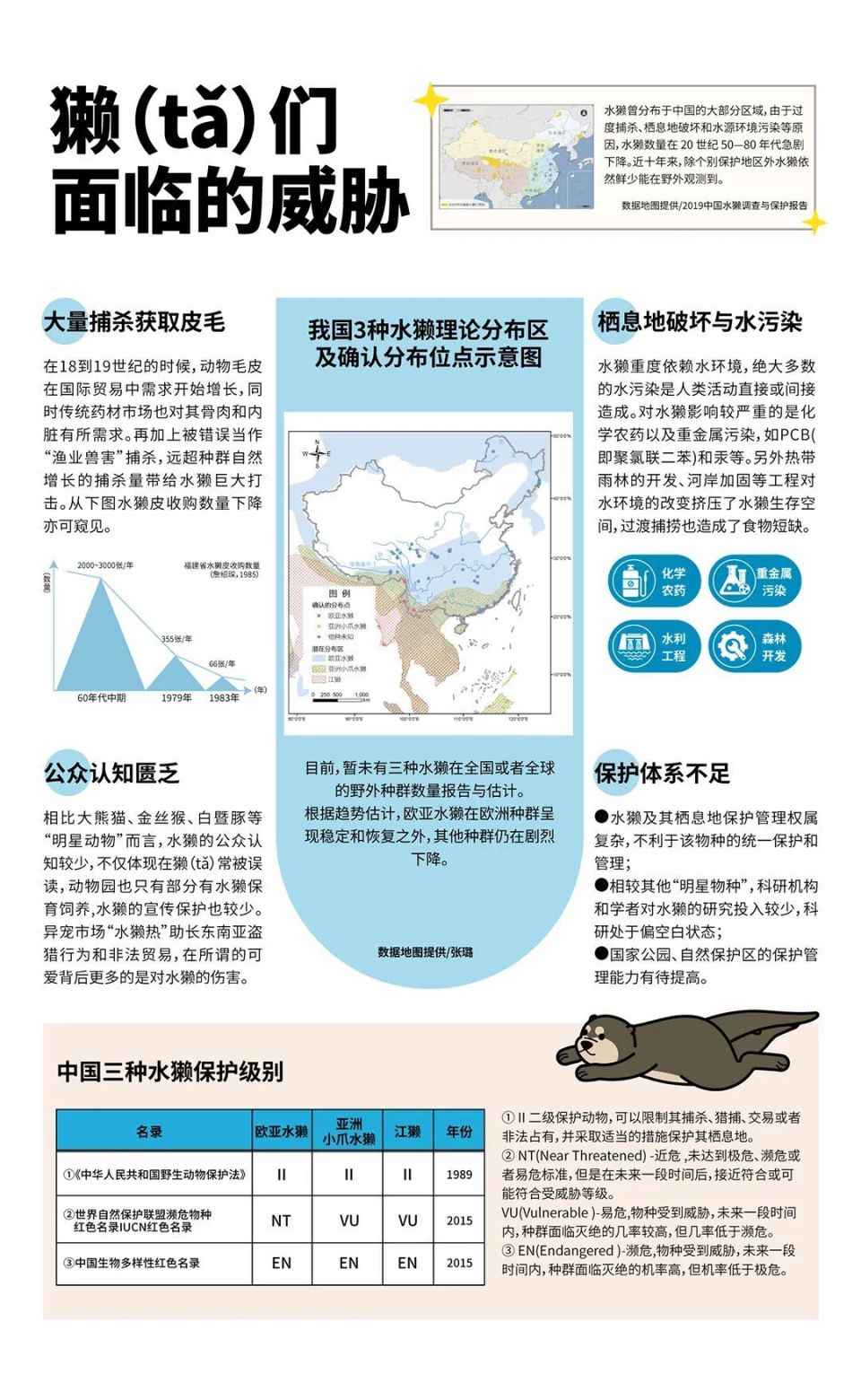 我国古代的人利用水獭,这种有限的利用不会对水獭种群造成影响。然而,进入19世纪,捕杀水獭获取皮毛的需求骤增,再加上栖息地被破坏等原因,水獭数量锐减。 它们在许多地方销声匿迹 ,这些世代与我们共享一片土地的生灵,逐渐成为陌生的物种,甚至被我们遗忘。