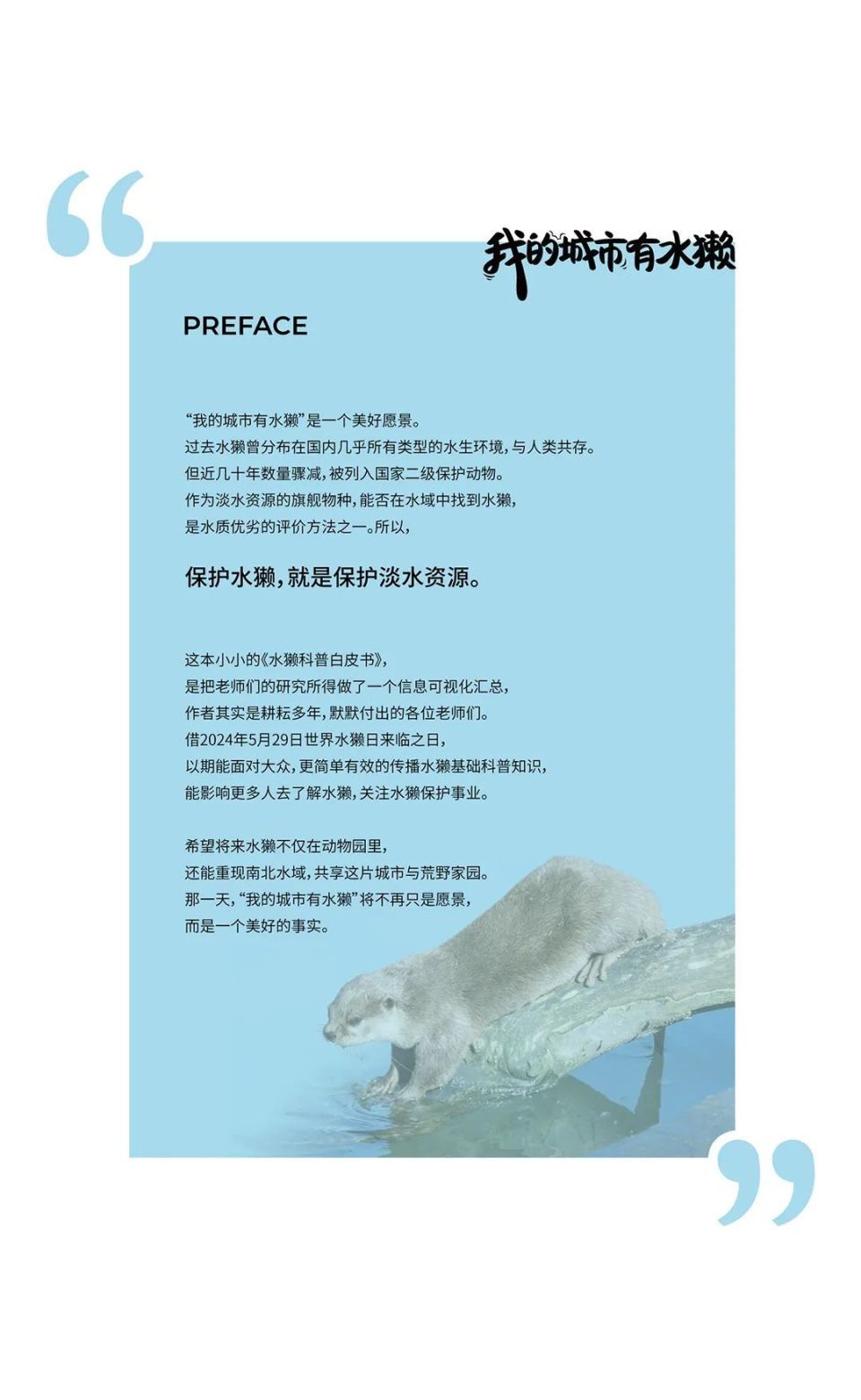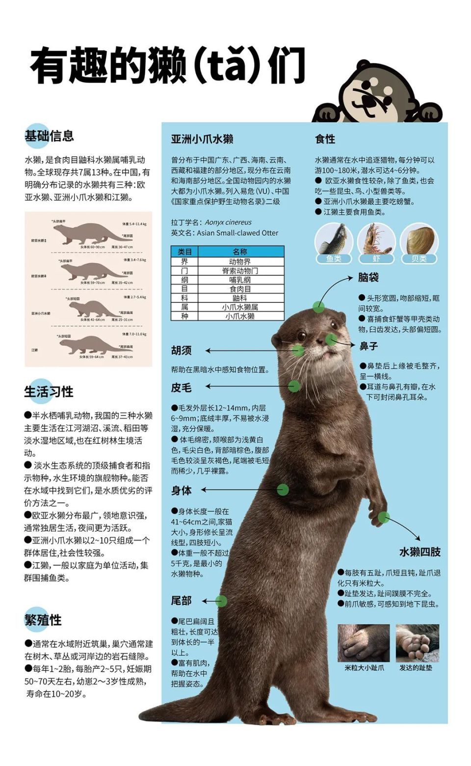 现在,我国的3种水獭都被列入国家二级保护动物。随着环境保护,水獭近年来逐渐回归,珠三角、浙江沿海海岛、青海三江源等陆续发现了野外欧亚水獭踪迹。 这不仅是水獭回来了,也说明我们的淡水环境正在逐步变好。