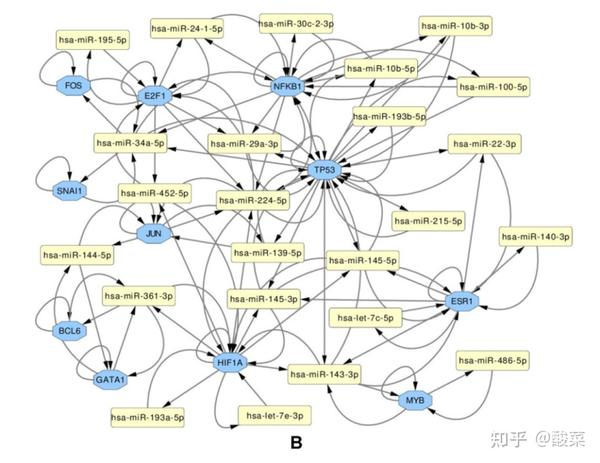 构建ceRNA网络,是生信研究多分子类型的分析中的必备保留项目。比较常见的分析方式是以miRNA为轴心,用多个数据库预测与之相互作用的mRNA或者lncRNA,又分别对其得到的mRNA或者lncRNA取交集,再导入Cytoscape中构建互作网络。另一种常见的生信数据库预测转录因子蛋白与DNA的交互,这一步可以与miRNA上游无缝衔接。
