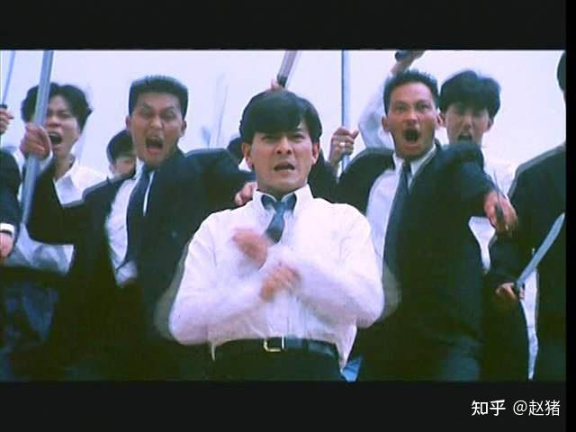 这里要特别强调一点,《冲击天子门生》中有一个经典场面,镜头从下往上仰拍,台阶上的刘德华身着丧服独自面对龙方率领的上百黑帮打手,潇洒的一挥手后,身后涌现出众多小弟。在1991年的录像厅年代,这种简单直接的画面冲击力,让当时还未成年的我荷尔蒙飙升!另一个有趣的事,影片中刘德华所在社团也叫“洪兴社”。