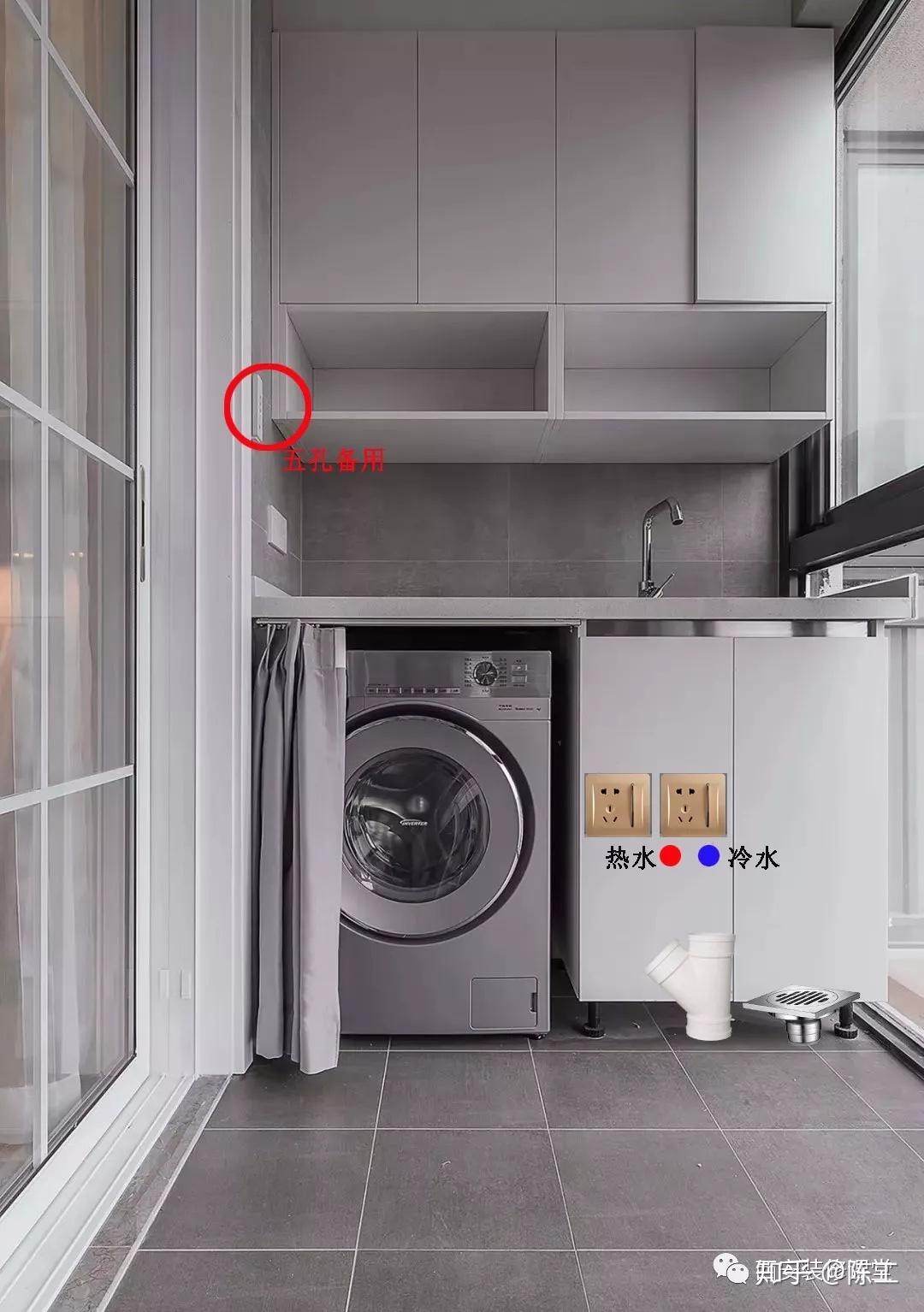 2》 只有洗衣机镶嵌 。此时只需要在镶嵌的洗衣机柜里头设计一个五孔插座,切记,不是洗衣机台面上头,而是隐藏在洗衣柜里头,还有避开洗衣背面,尽量把插座放置在洗衣机的左右方向。