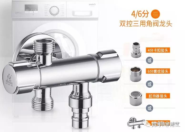 ▲洗衣机和洗手池并存,一个上水,只需要买个三通角阀就可以,记住,三通角阀有自带洗衣机卡扣的,购买时注意,还得注意是4分卡扣还是6分卡扣。这样就不需要洗衣机龙头了,一个头接洗衣机,一个头接洗衣池凉水。此处应该注意到,厨宝的凉水从哪里接?切记,有厨宝的话直接四通角阀全部搞定。