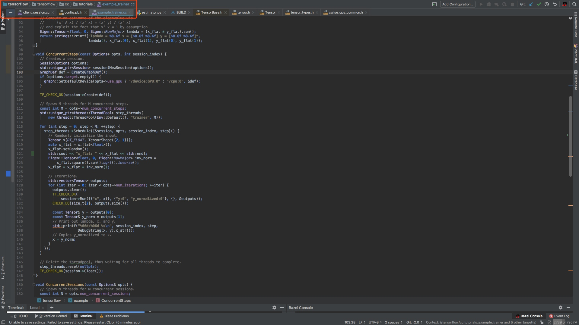 首先,一定是要找个好工作来看源码,很多人推荐vs code、sublime,我试过vs code+bazel的,好像也不错,但是后面做c++适应了clion之后,除了资源要求比较多,还是蛮不错的,使用c++一般推荐使用cmake来看编译项目,但是TensorFlow是bazel的,无法直接支持,最开始,这边是自己写简单的cmake,能够实现简单的代码跳转,但是涉及到比如protobuf之类的编译过后产生的文件无法跳转,比较麻烦,不够纯粹,很早之前知道clion有bazel的组件,但是不知道为啥一直搞不通,上周找时间再试了试,发现竟然通了,使用之后,这才是看tf源码的真正方式: