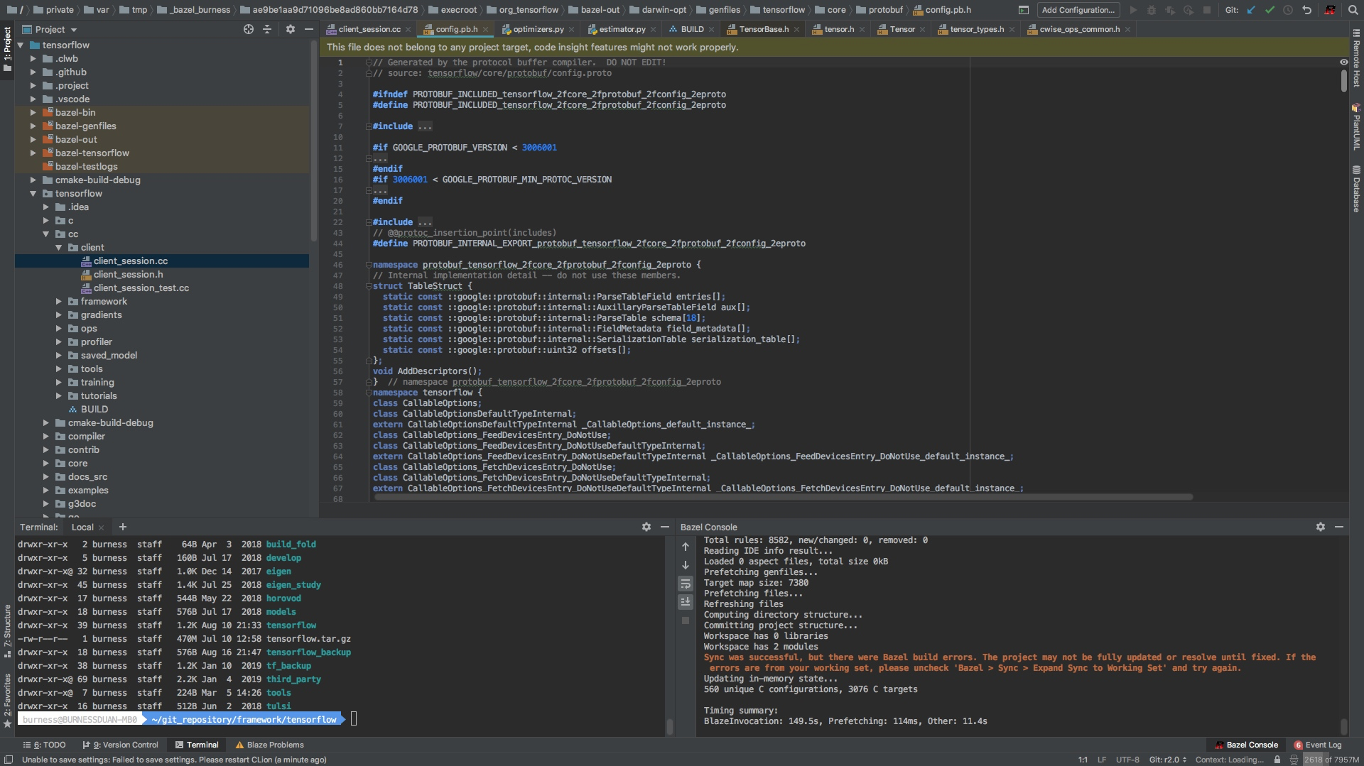经过上面几步之后,接下来就要经过比较长时间的等待,clion会导入bazel项目,然后编译整个项目,这个耗时视你机器和网络而定(顺便提一句,最好保证比较畅通的访问github的网络,另外由于上面targets:all,会编译TensorFlow所有的项目,如果你知道是什么意思,可以自己修改,如果不知道的话我先不提了,默认就好,期间会有很多Error出现,放心,问题不大,因为会默认编译所有的模块)