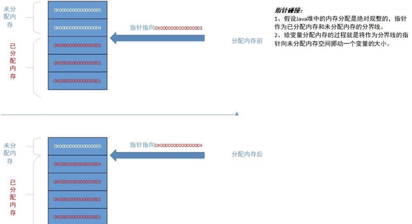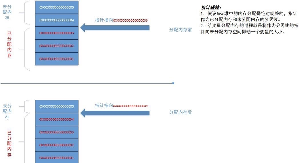 2.1.1 指针碰撞分配 。假设Java堆中内存是绝对规整的,所有被使用过的内存都被放在一 边,空闲的内存被放在另一边,中间放着一个指针作为分界点的指示器,那所分配内存就仅仅是把那 个指针向空闲空间方向挪动一段与对象大小相等的距离,这种分配方式称为“ 指针碰撞 ”(Bump The Pointer)。