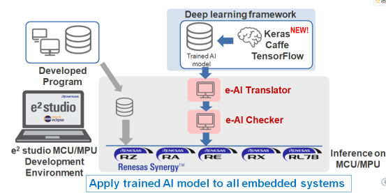 瑞萨电子提供了一整套e-AI解决方案,包括:ue-AI translator:将Caffe或者TensorFlow 网络以及其他深度学习框架导入至MCU/MPU开发环境中;ue-AI checker:基于输出结果,计算出MCU/MPU中的ROM/RAM安装尺寸以及推理执行时间;ue-AI importer:连接专门用于嵌入式系统的新AI框架,在MCU/MPU的开发环境中实现实时性能和较小的资源。
