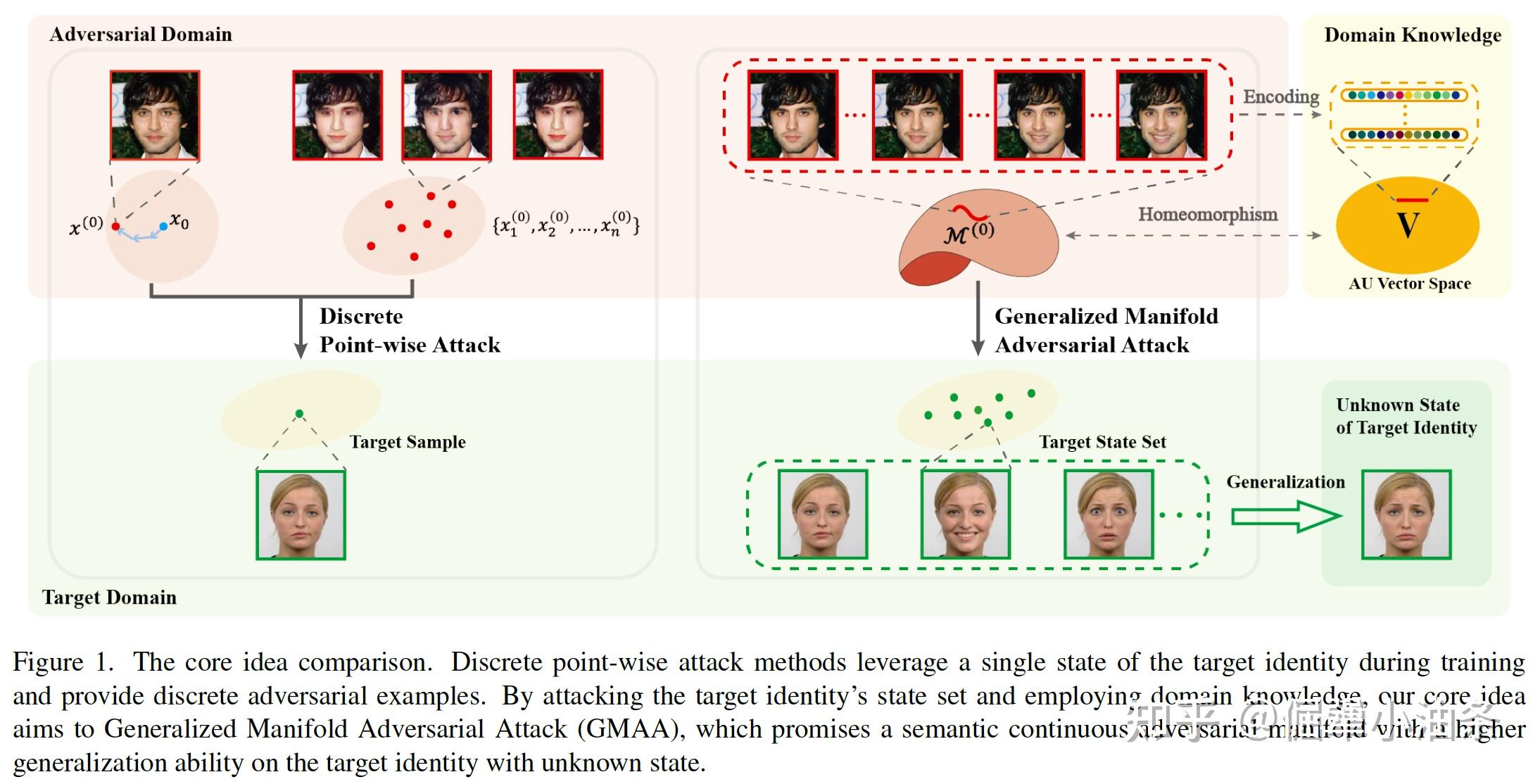 (2)针对对抗域。先前的工作都是寻找一个或者几个对抗样本,对抗样本其实相当于神经网络的漏洞,在高维空间中找到了一个两个,或者好多个离散的漏洞,在我们看来是远远不够的,因为一个对抗样本的出现,可能意味着它所在的那一片区域对于神经网络而言都是脆弱的。我们也知道离散的点测度始终是0,用数学上的话说,找到再多这样离散的点,都是平凡的。因此,我们希望在高维样本空间中 找到一个对抗流形 ,在这个流形上的每一个点都是对抗样本。