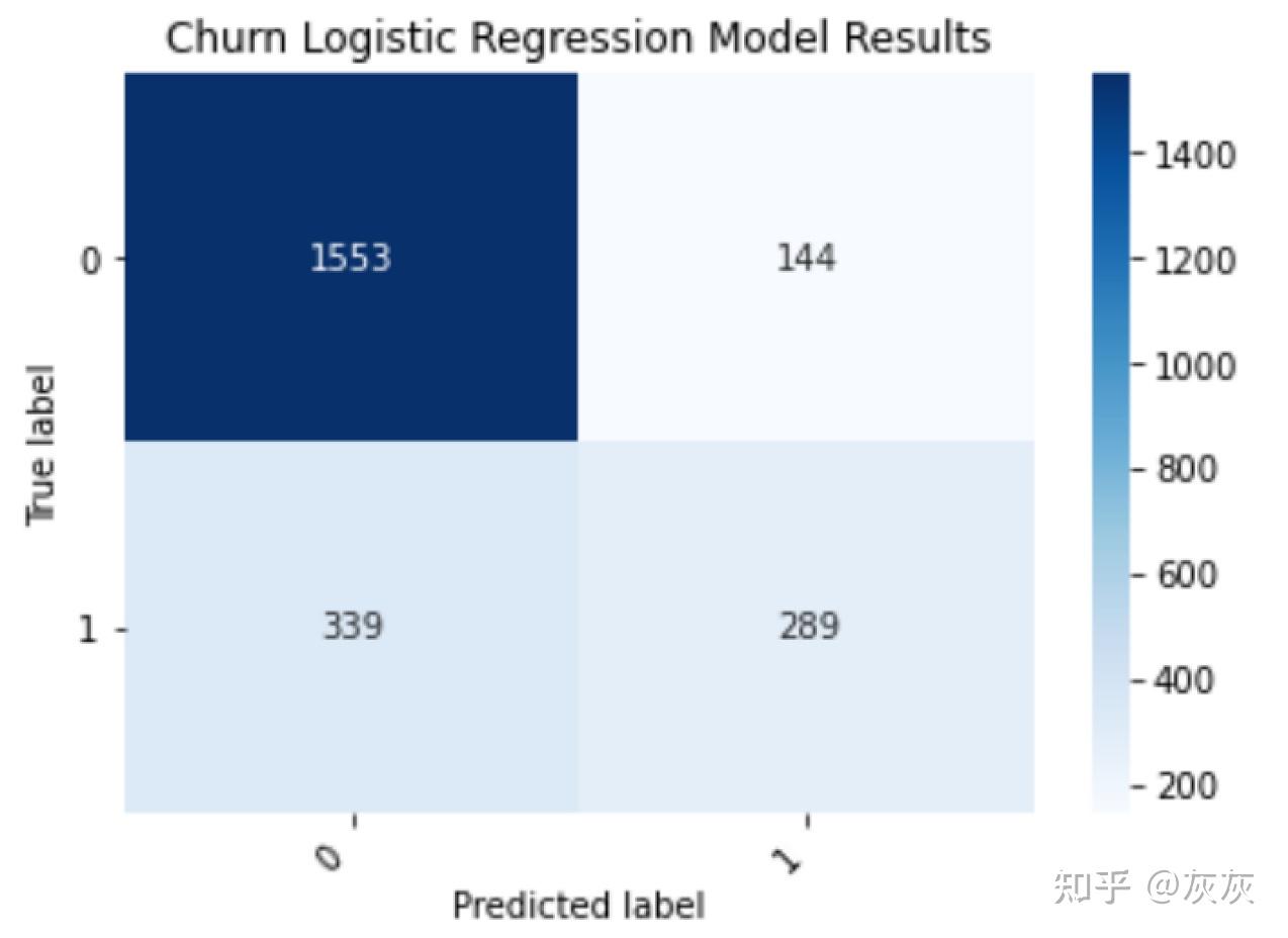 那么,这个数字究竟说明了我们模型的性能如何?沿着混淆矩阵的对角线看,让我们注意数字1553和289。数字1553对应于模型正确预测的不流失的客户数量(意味着他们留在公司)。数字289对应于模型正确预测的客户流失数量。