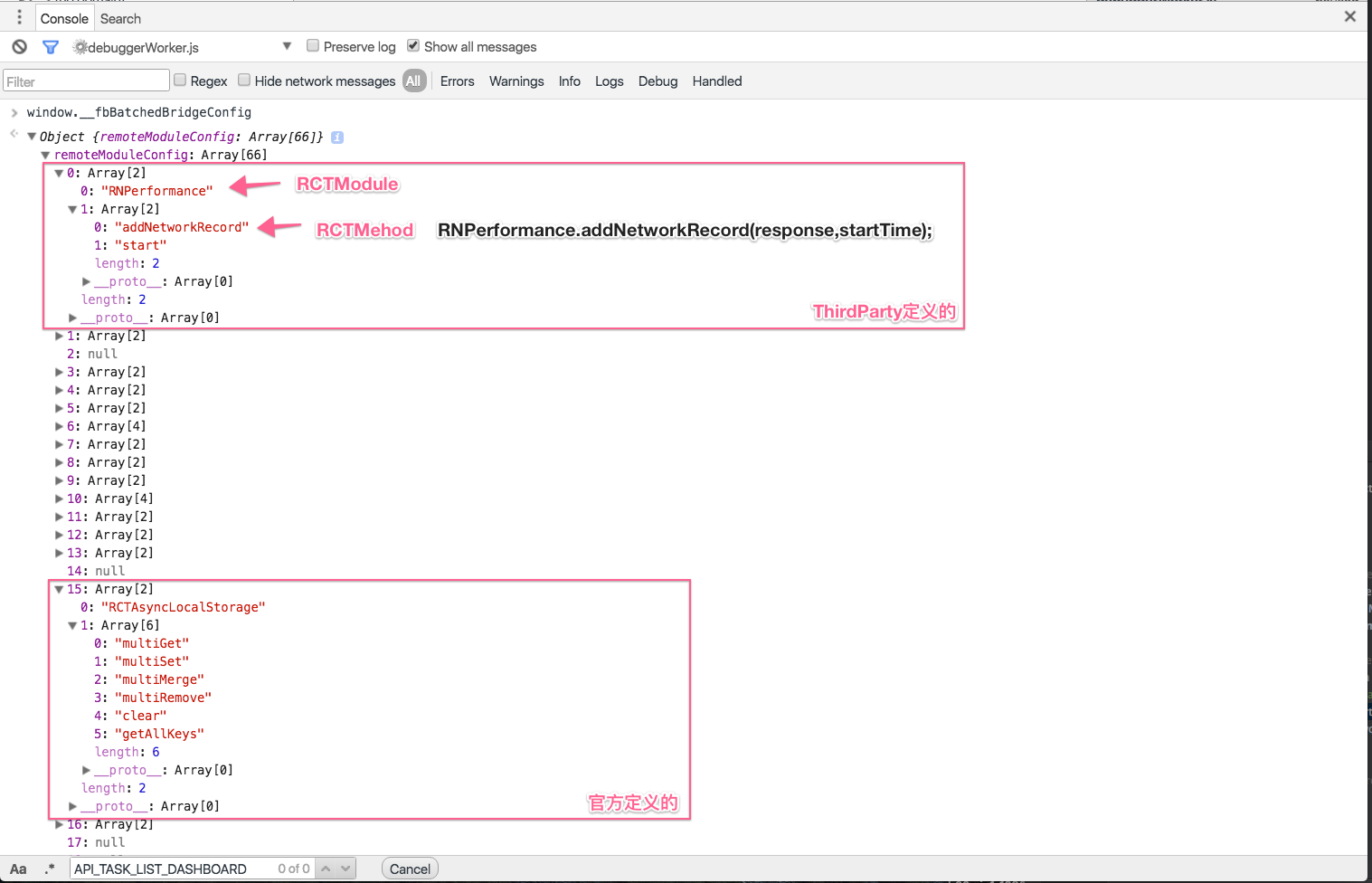 发送的这个消息非常有意思,发送的时候回注入一个字典.字典中有很多 module/method/id 的映射关系.这里的module/method 就对应RCTModule 和 RCTMethod. 这个字典在chrome中也有体现(下图).一个真实项目中的字典可以参见附录A