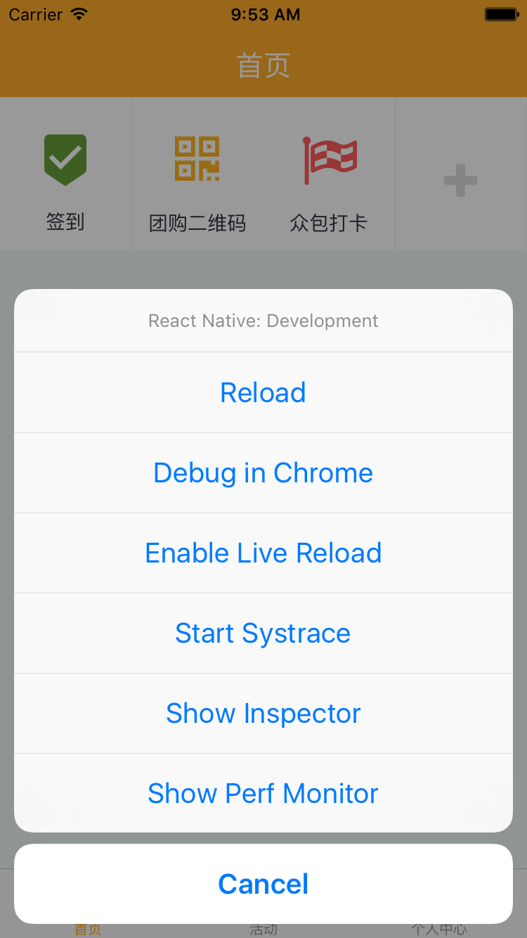现在App在设备上正常的跑着,下一步就是进入 debug 模式,这样就可以通过Chrome的webSocket inspector 去查看 React Native 编译过的版本 和 未编译版本 之前传输的数据了.
