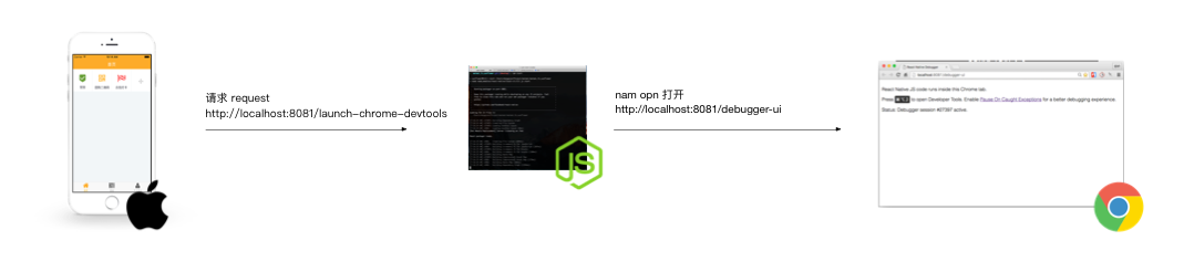 当你点击Debug in Chrome 的时候,客户端会发起一个请求 http:// localhost:8081/launch-c hrome-devtools .然后Packager会接到这个请求,然后通过 sindresorhus/opn 执行两个操作.