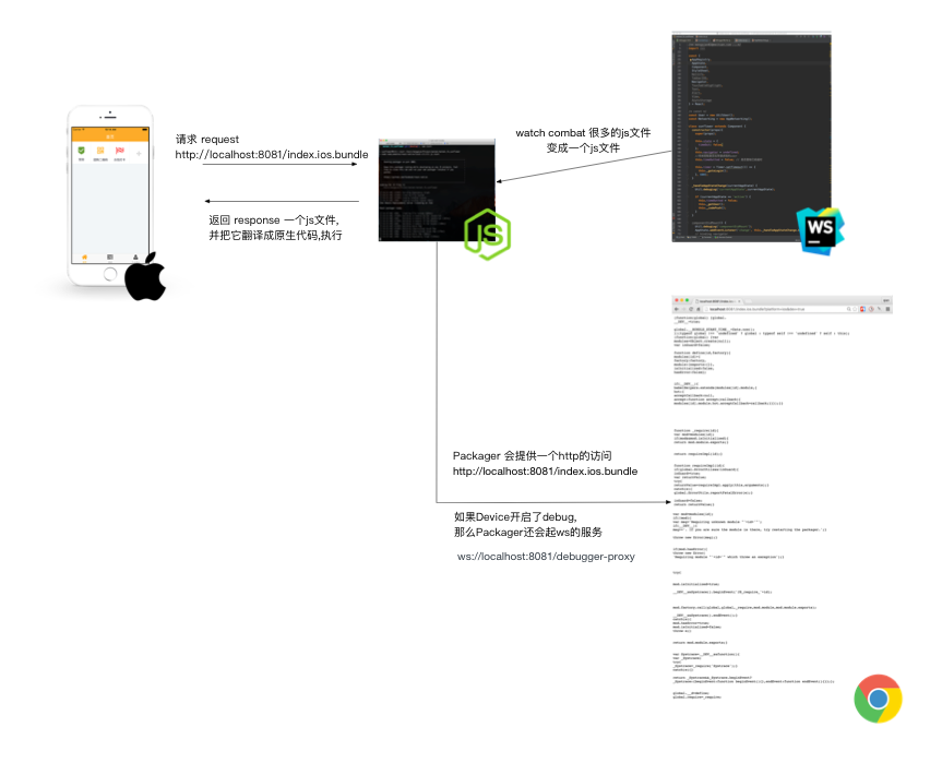 Packager 是跑在本地的,一旦他收到浏览器或者App的请求,他会使用Babel和Facebook自家的grapher 去collect,concat,transplie and modularize,你的 React Native JavaScript (D) 代码编程一个 response. 所以当你改动代码并保存的时候你会看到 Terminal 中会重新 transforming.
