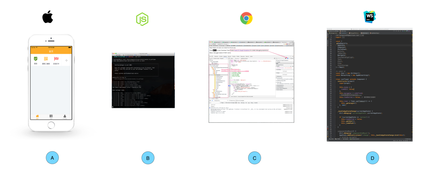 - Chrome 浏览器从Packager加载你的React Native JavaScript,并提供内置的debugging 支持,就像 debug 普通的JavaScript代码一样