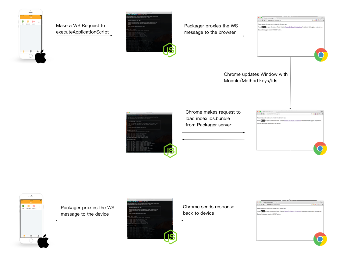 你的App会发送3个WebSocket ping到你的Chrome. 如果Chrome反馈给你 expectedId/sessionId,那么链接将会马上建立.否则设备会抛出一个红屏”Runtime is not ready”.相信做过React Native 开发的对这个红屏不会陌生.一般 Command+R 一下就可以解决.你的App和浏览器之前的交互中间都会经过 NodeJSServer.因为http和ws服务都是他运行的.