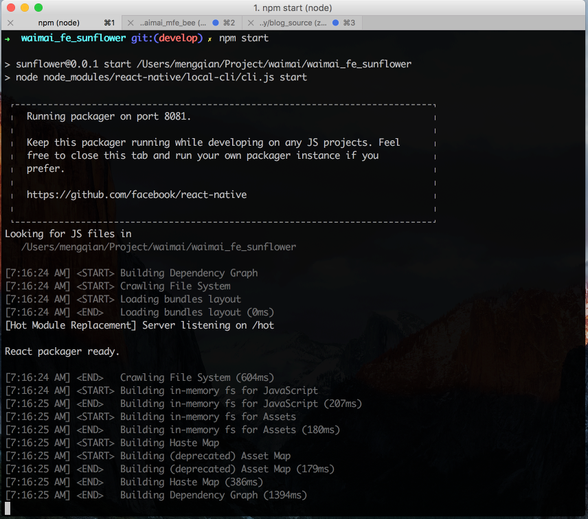 - 一个NodeJS server. 称为 Packager. 运行在 terminal中