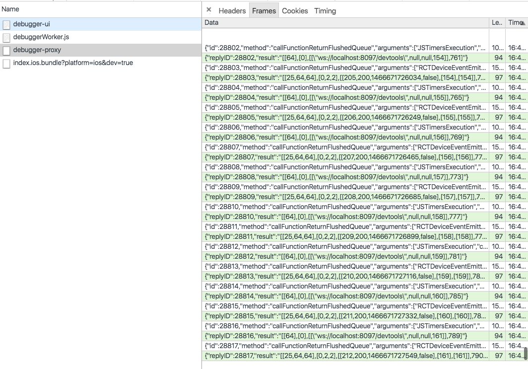 当 executeApplicationScript 被设备成功接受到之后.App就会重新加载js,呈现给我们.感觉Chrome和App之间通过WebSocket通信,屌屌的. 至此你可以在Chrome像调试网页的JS一样调试ReactNative的js了.不过请注意很多第三方node_module的东西无法console出来.就算是在下断点的时候.比如lodash,具体原因不清.