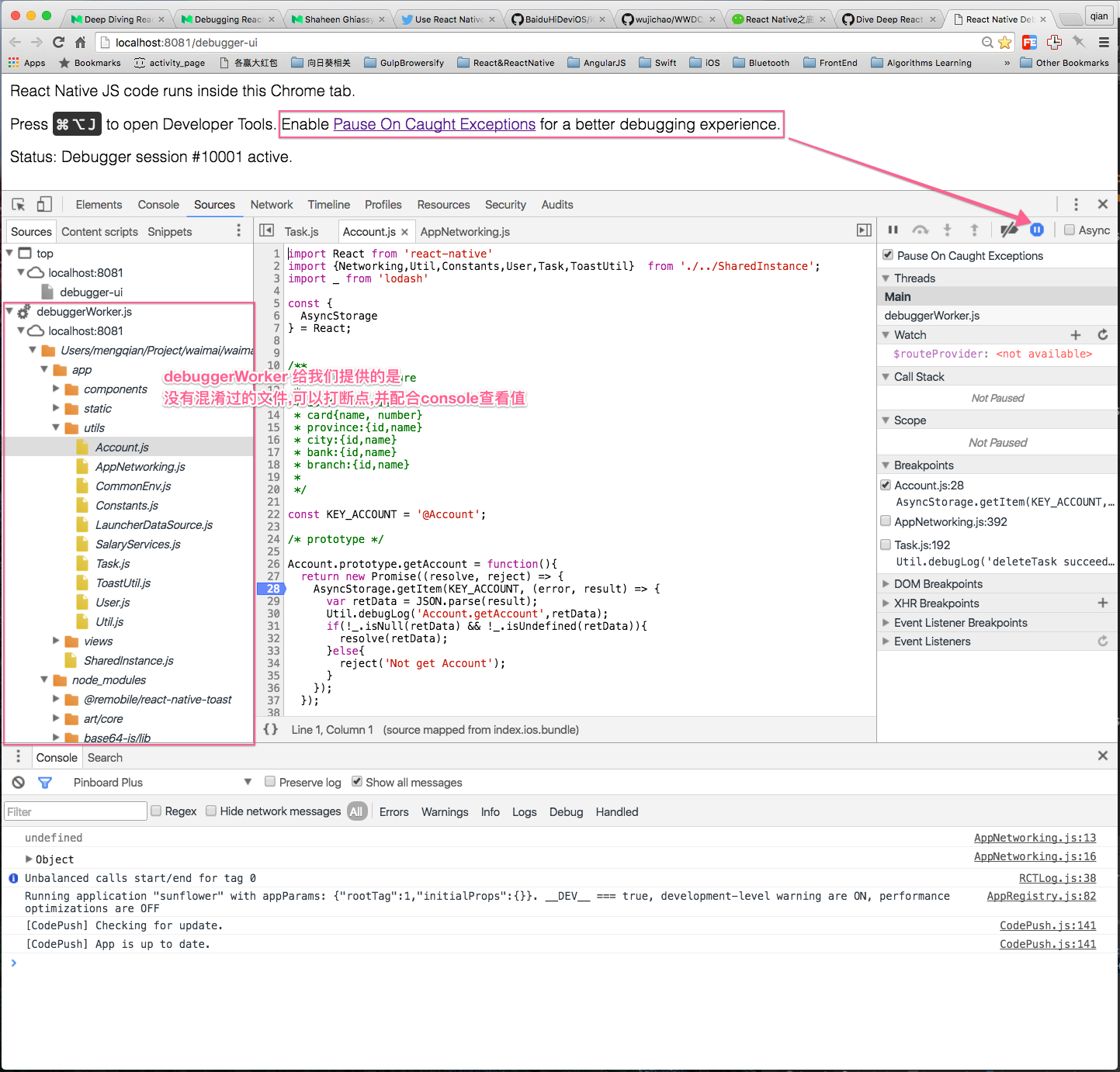 如果你和我一样,当你看到React Native 简单的debugging的时候,你一定会觉得这太拽了.在Chrome浏览器里打下断点,就可以终端iOS应用.而且可以console和watch各种变量.