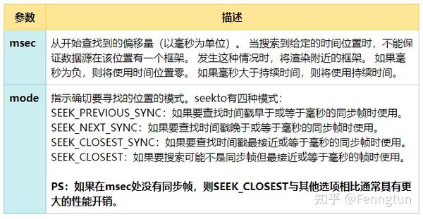 官网描述:播放时,可以通过seekto调整播放的位置,API 26之前只需要一个参数int msec,但是API 26之后则需要传入两个参数(long msec, int mode)。两个参数分别为时间戳和跳转模式。