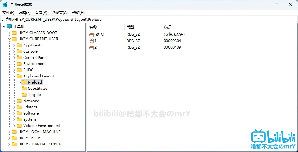 是否能将美式键盘设为默认? ※ 注册表的值以[名称(数据)]的形式标注,如已经存在的[1(00000804)]