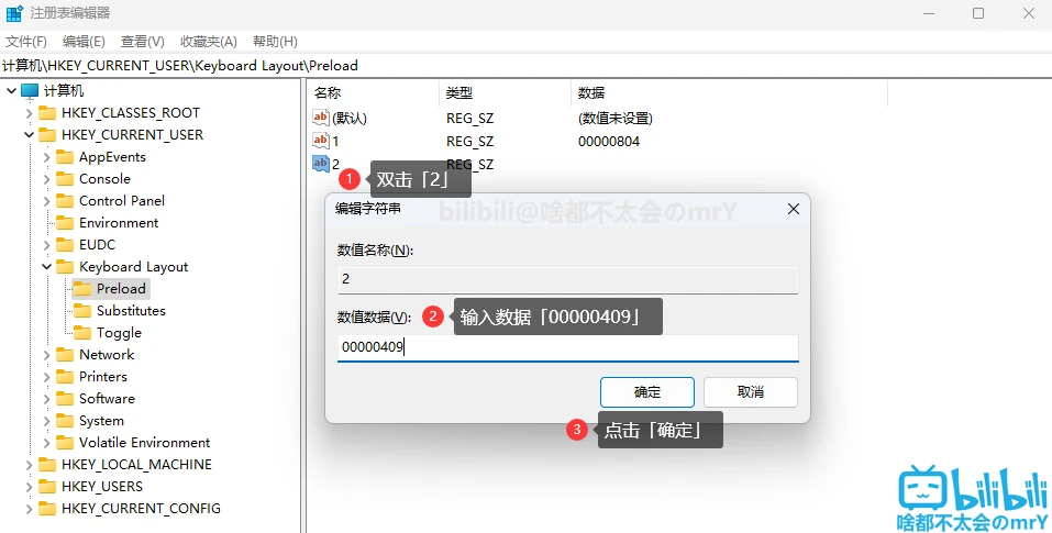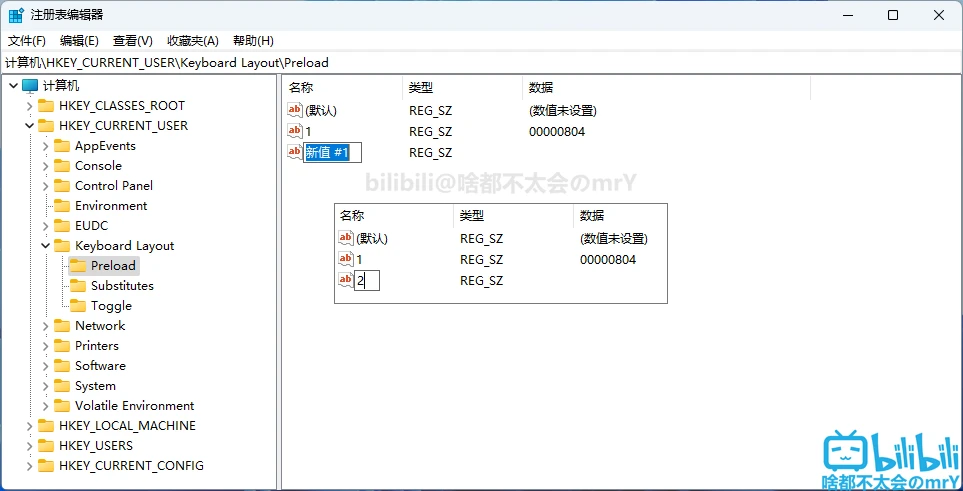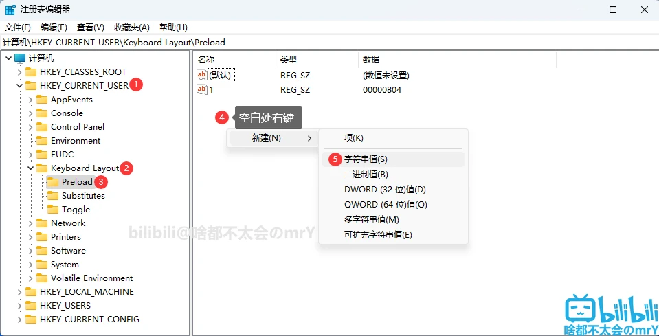 1.按下图序号找到 「 计 算机\HKEY _CURRENT_USER\Keyboard Layout\Preload 」 ,在空白处 单击右键→新建→字符串值